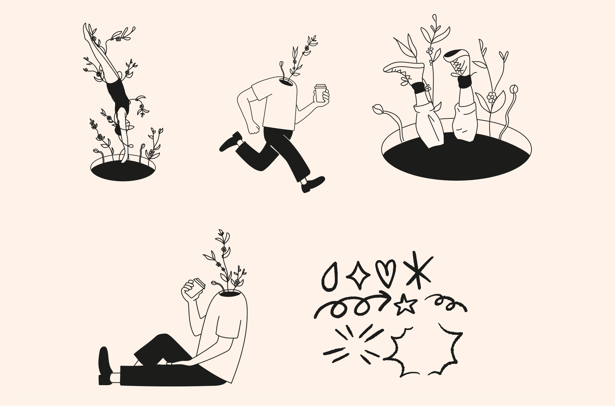 Las ilustraciones funcionan como un hilo conductor entre el origen artesanal del café de pota y una estética fresca y expresiva. Cada trazo recoge símbolos del proceso: vapor, gotas, plantas y gestos cotidianos. Un sistema vivo que aporta calidez sin renunciar a la simplicidad.